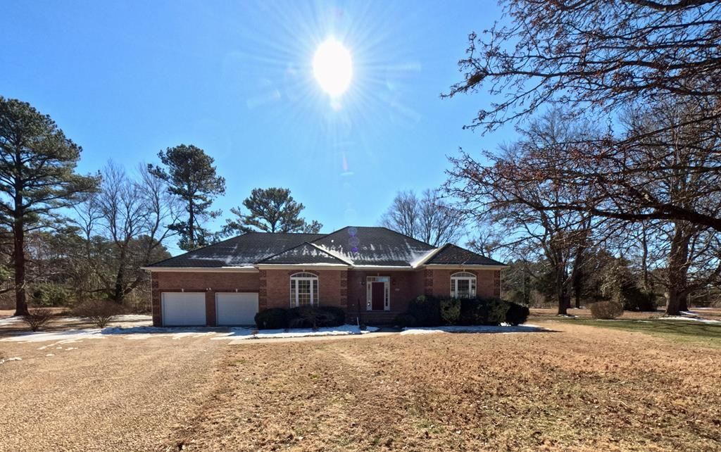 This brick ranch home offers primary bedroom suite with tile shower, jetted garden tub, private lavatory, double sink vanity, spacious closet with shelving. Great room with gas-log fireplace, dining area, kitchen. Dining room. Two guest bedrooms. Bonus Room/Office. Full bath with tub/shower. Glass enclosed sunroom with entrances to primary bedroom and great room. Foyer. Deck. Lots of hardwood floors. Two car attached garage. Walls/drywall are ready to paint! Seller will provide paint credit with suitable offer. Breezeline internet available for connect.